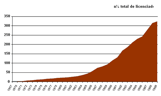 Cerca de 15 anos é o tempo que demora a constituir este corpo de licenciados em Antropologia. Podemos verificar a rapidez deste processo pela acentuação da curva do total de licenciados a partir de meados da década de 80 ou pelo peso que a percentagem dos licenciados entre 1985 e 1999 representa no total: nesses 15 anos diplomaram-se mais de 80% dos antropólogos que responderam ao inquérito. Mais uma vez este crescimento explosivo e muito concentrado num curto período de tempo dos nossos diplomados explica-se pela criação quase em simultâneo, entre o final da década de 70 e o princípio da de 80, das três maiores licenciaturas do país.