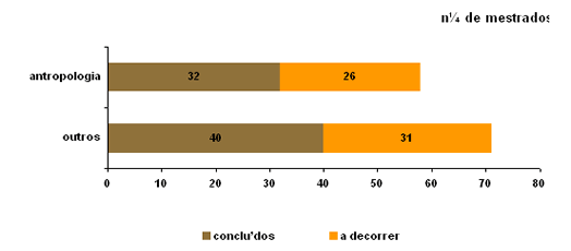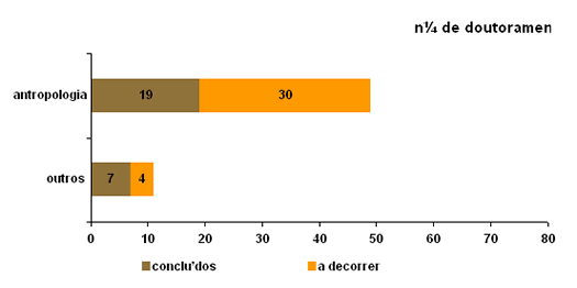 Ainda ao nível da formação, existem indicadores de grande dinamismo no reforço ou na procura de novas qualificações por parte dos antropólogos. Isso mesmo é evidenciado pelos 98 titulares do grau de mestre ou doutor (28%), ou pelos 91 casos de investigadores inscritos e a realizarem mestrados ou doutoramentos (27%)[2]. O mesmo tipo de esforço no sentido de aumentar e diversificar competências estava sobejamente documentado na profusão de cursos e formações complementares que os antropólogos haviam adquirido ou estavam a frequentar.
