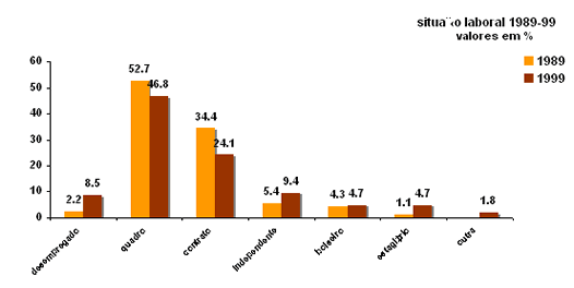 Quando se compara a situação laboral de 1999 com o que se passava uma década antes, a evolução parece ser claramente negativa. Não só diminuiu a percentagem de trabalhadores integrados em quadros permanentes, como baixou o número de contratados. Simultaneamente, a taxa de desemprego, que em 1989 era meramente residual, subiu para 8,5%, enquanto a percentagem de trabalhadores colectados como independentes registava uma duplicação. Um sinal eventualmente mais positivo poderia ser o dos estágios para licenciados, realidade quase desconhecida em 1989, mas que em 1999 atingia os 4,7%.