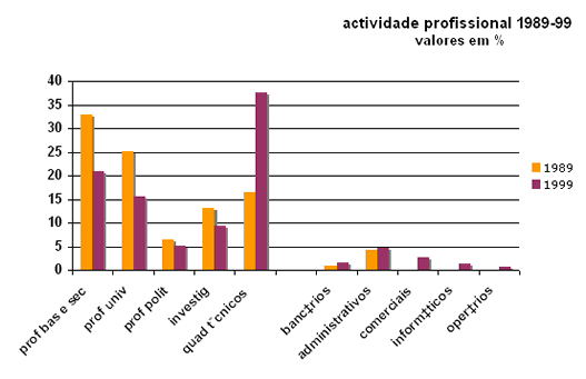 Esse mesmo período de dez anos foi suficiente para mudar radicalmente a distribuição relativa dos antropólogos pelos seus principais sectores de ocupação profissional. Em 1989, os antropólogos dependiam quase exclusivamente do ensino e da investigação e, muito embora uma década depois este sector de actividade ainda represente metade do emprego, expandiu-se e consolidou-se a presença dos antropólogos entre os chamados “quadros”, em profissões técnicas muito diversas mas de elevada qualificação. Neste período de mudanças, um aspecto permaneceu imutável: a dependência dos antropólogos relativamente aos empregos gerados pelo sector público da economia, seja no ensino e na investigação, seja na administração central e local ou nas empresas públicas.